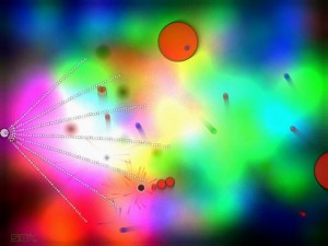 It’s psychedelic feel and trippy dance music along side the animated technicolor backdrop are wild. The gameplay is excellent. Move your little orb around the screen to shoot at the circular globs around you. Pop them and their smaller spawn to keep yourself safe, but don’t forget to pick up your power-ups along the way. They’ll change your ammunition from firing double rounds to firing 6 shots at a time, spraying out like a fountain, emanating like an explosion around you and even bouncing off the walls!